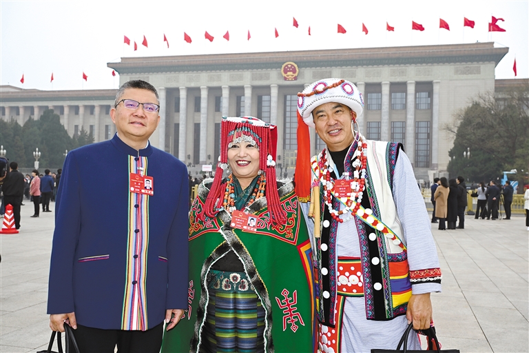 西藏全國(guó)人大代表格桑卓瑪(中)與云南省全國(guó)人大代表在人民大會(huì)堂前合影留念。記者 旦增西旦 攝