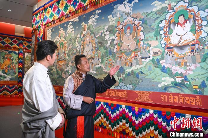 圖為孜東唐卡畫師介紹唐卡《吐蕃贊普世系大唐卡金子明鏡》。貢嘎來松 攝