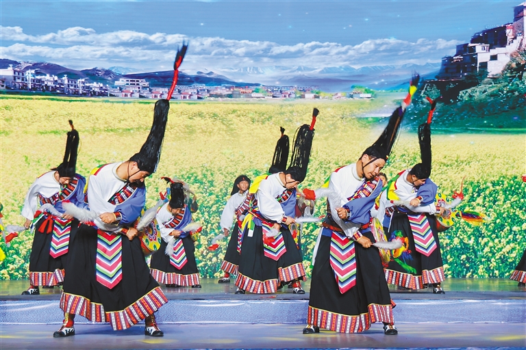 說唱《聲生不息》以鏗鏘有力的節(jié)奏,再現(xiàn)世界最長史詩《格薩爾王傳》中降魔濟世的英雄傳奇;舞蹈《達姆韻》以工布響箭舞步、熱瑪琴伴奏,將對生活的熱愛、對自然的敬畏,化作熱烈奔放的舞步,演繹著傳承千年的文化記憶,彰顯著工布獨特的生命張力與文化自信;《扎西央恰》將千年宣舞與噶爾舞創(chuàng)新融合,以莊重舒緩的舞步訴說著高原先民對天地的敬畏,以雄渾激昂的鼓點展示雪域歷史的風(fēng)云激蕩,在莊重與激昂中訴說阿里高原的歷史變遷……