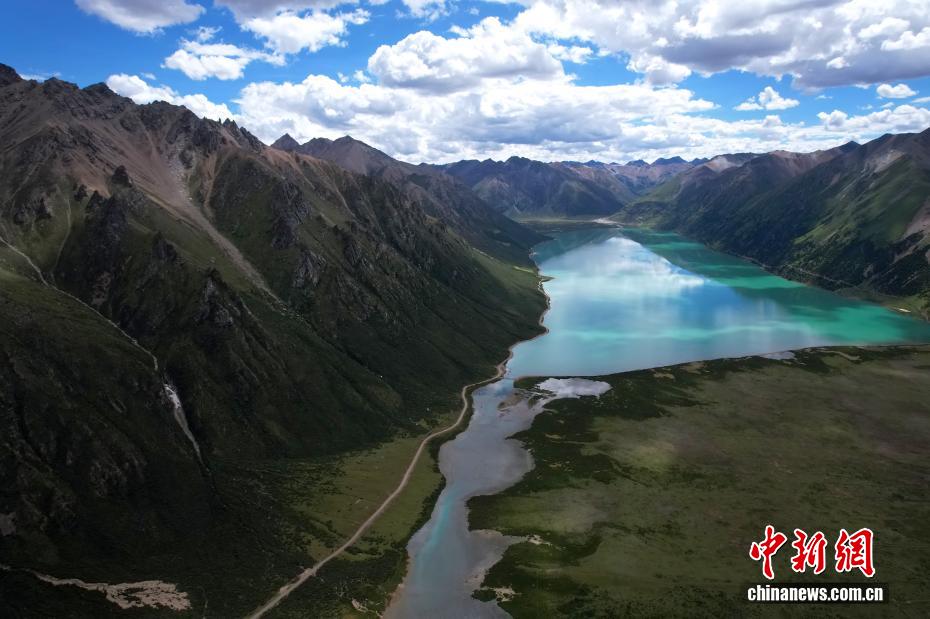 7月21日,嘉乃玉錯景色。嘉乃玉錯國家濕地公園位于西藏那曲市嘉黎縣境內(nèi)。夏日,嘉乃玉錯碧波蕩漾,湖邊綠意盎然,在藍天白云映襯下,景色如畫。(無人機照片)中新社記者 李林 攝