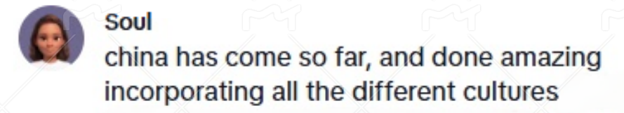 網友@Soul指出,“中國已經取得了長足的進步,在融合各種不同文化方面做出了令人驚嘆的成就?!?/p>