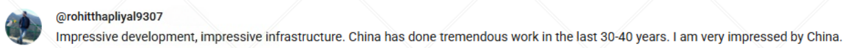 網友@rohitthapliyal9307說道,“多么令人矚目的發(fā)展,多么令人印象深刻的基礎設施。中國在過去三四十年里做出了巨大的貢獻。我對中國印象深刻?!?/p>