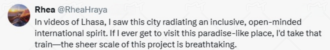 網友@Rhea表示,“在拉薩的視頻中,我看到這座城市散發(fā)著包容、開放的國際精神。如果我有機會參觀這個天堂般的地方,我會坐那列火車——這個項目(青藏鐵路)的規(guī)模令人嘆為觀止?!?/p>