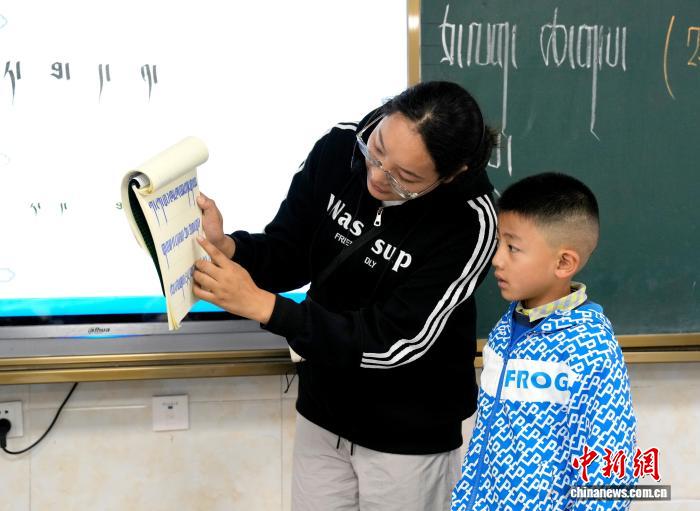 9月1日,拉薩市第一小學一年級二班,藏語文老師扎西央欽正在輔導學生。近日,西藏拉薩市秋季學期開學,各項教學工作有序開展。中新社記者 李林 攝