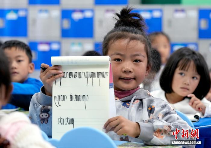 9月1日,拉薩市第一小學一年級二班的學生展示在藏語文課上書寫的藏文。近日,西藏拉薩市秋季學期開學,各項教學工作有序開展。中新社記者 李林 攝