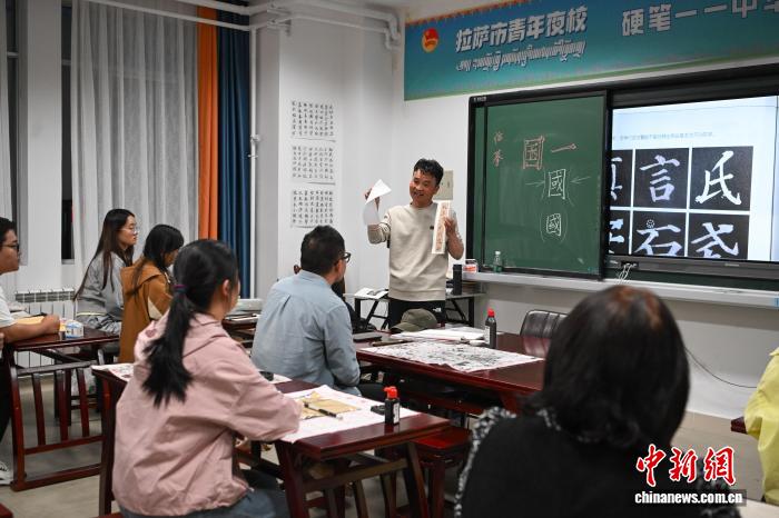 9月1日,2025年西藏自治區(qū)拉薩市第二期“青年夜?!闭介_班。圖為夜校學員在上書法課。中新社記者 貢嘎來松 攝