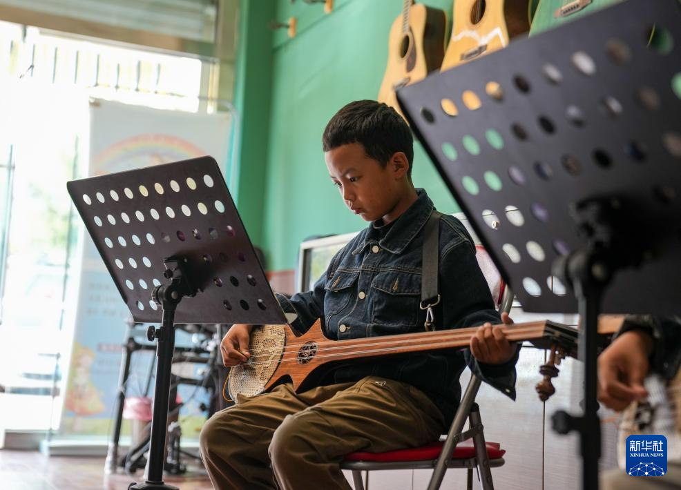 9月13日,在拉薩市古樂(lè)扎念琴行,一名男孩在彈奏扎念琴。新華社記者 晉美多吉 攝