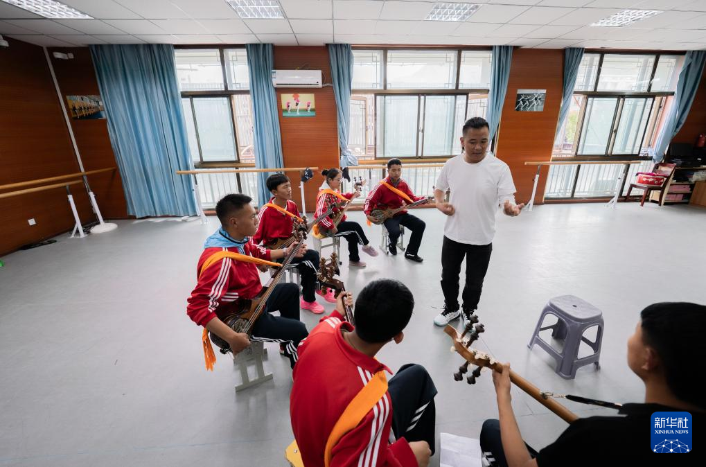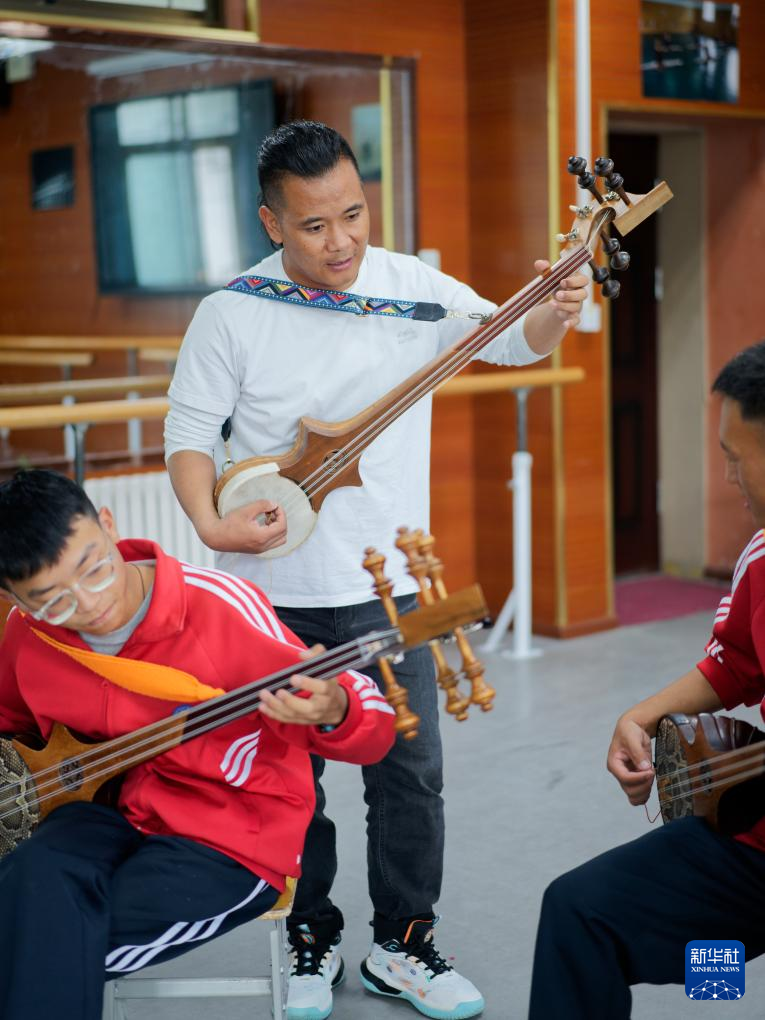 9月9日,在拉薩市第二中等職業(yè)技術(shù)學(xué)校,洛桑次仁老師在給孩子們傳授扎念琴?gòu)椬嗟囊I(lǐng)。新華社記者 丁增尼達(dá) 攝