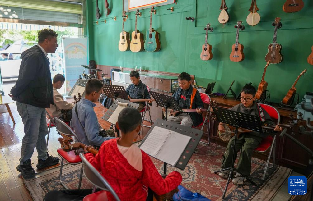 9月13日,在拉薩市古樂(lè)扎念琴行,桑嘎西熱老師在指導(dǎo)孩子彈奏扎念琴。新華社記者 晉美多吉 攝