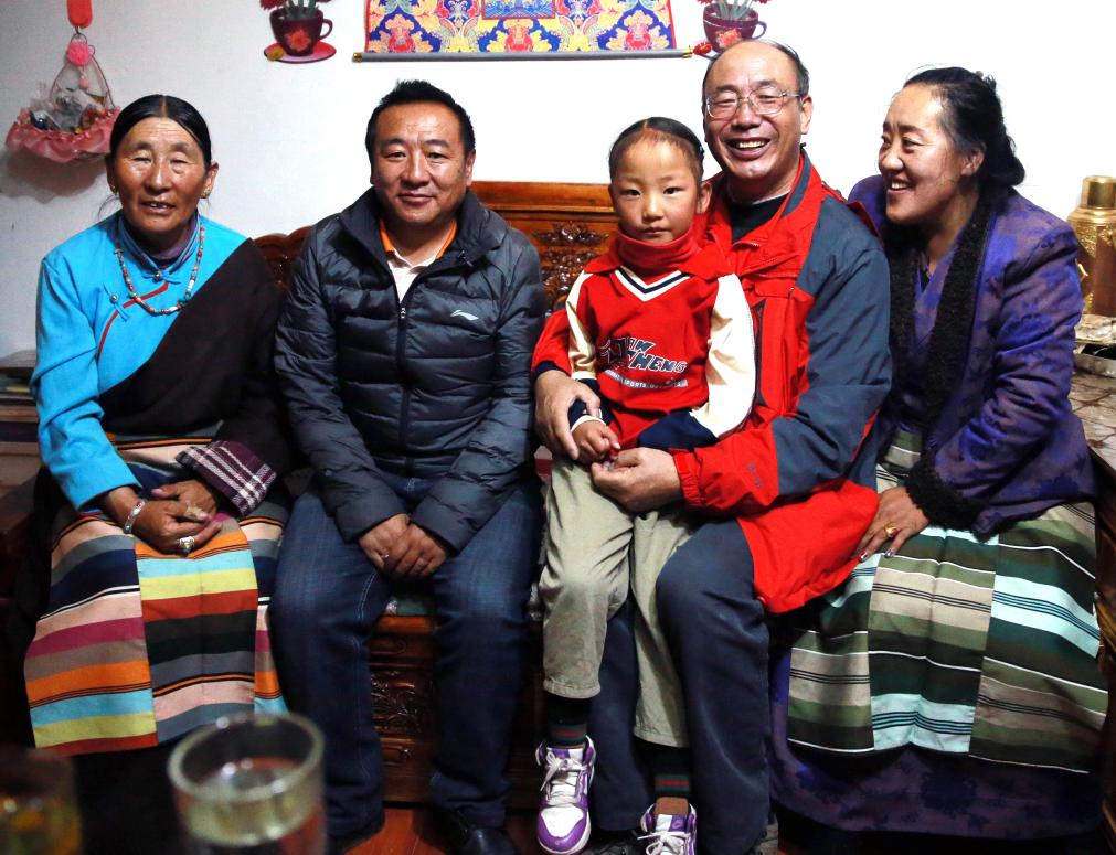 這是唐召明(右二)作為北京建藏援藏工作者協(xié)會(huì)志愿者到藏北草原向牧民群眾捐贈(zèng)撿拾牛糞的高原撿拾車時(shí),前去看望次仁石達(dá)(左二)一家,并與次仁石達(dá)的女兒小拉姆(中)以及阿媽達(dá)曲(左一)合影留念(王博軒2019年9月9日攝)