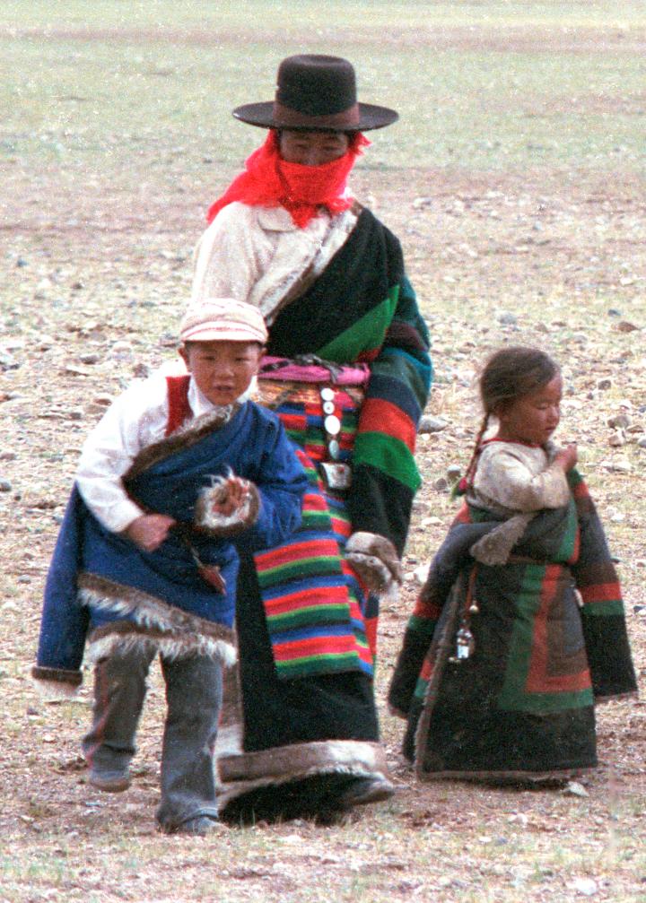 1987年,在西藏那曲地區(qū)文部辦事處(現(xiàn)那曲市尼瑪縣)賽馬會(huì)上,小男孩次仁石達(dá)(左一)和她阿媽達(dá)曲(中)在一起。新華社記者 唐召明 攝