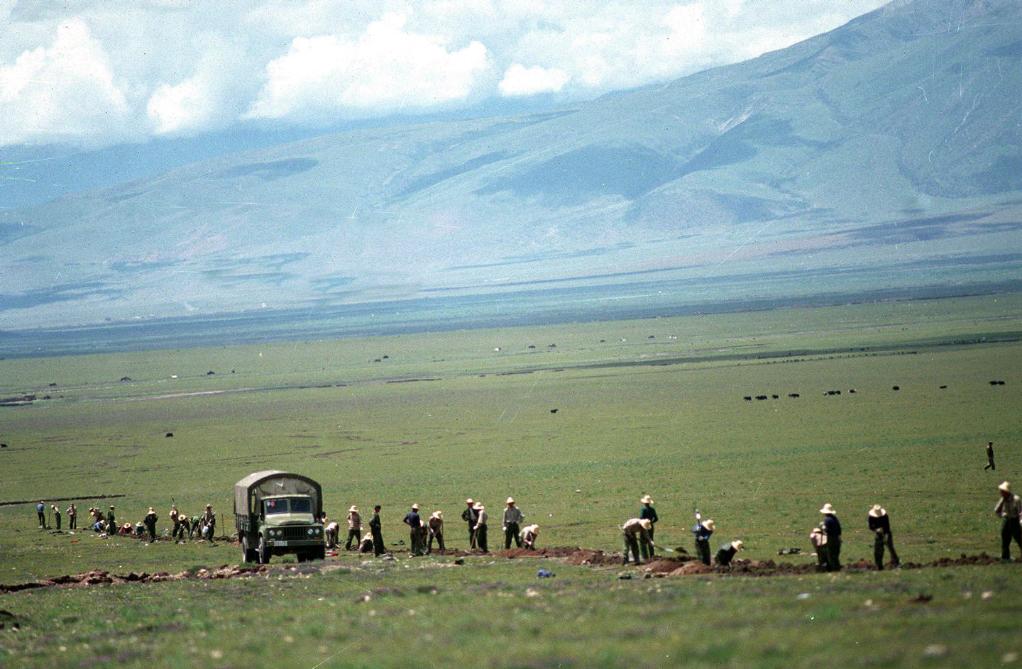 蘭州——西寧——拉薩光纜工程,從1997年7月開始施工。這是工人和駐藏部隊(duì)官兵在海拔4000多米的藏北草原上準(zhǔn)備鋪設(shè)光纜的情景。(1997年9月18日發(fā))