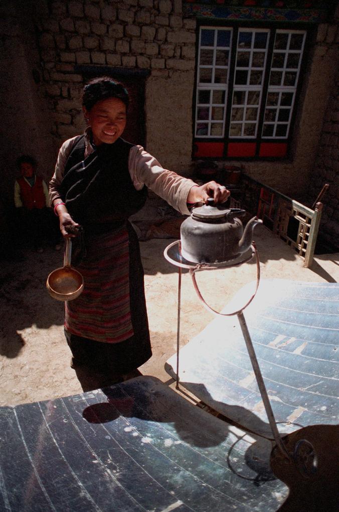 西藏江孜縣,次仁玉珍使用太陽能灶燒開水。這種太陽能灶十多分鐘就可以燒開一壺水,既省時(shí)、省力,又方便。 (1997年10月13日發(fā))