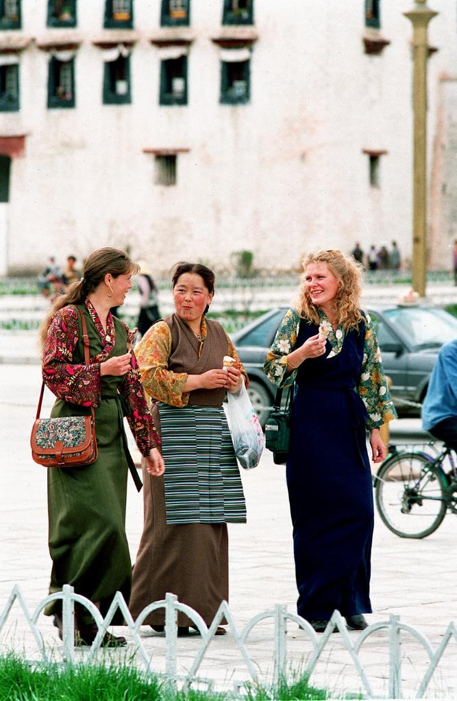 在拉薩市布達(dá)拉宮前,兩位身著藏裝的外國(guó)游客和一位藏族婦女交談。交通和旅游服務(wù)設(shè)施的逐步完善,為獨(dú)具風(fēng)情的西藏高原引來了更多的游客。(1997年11月13日發(fā))