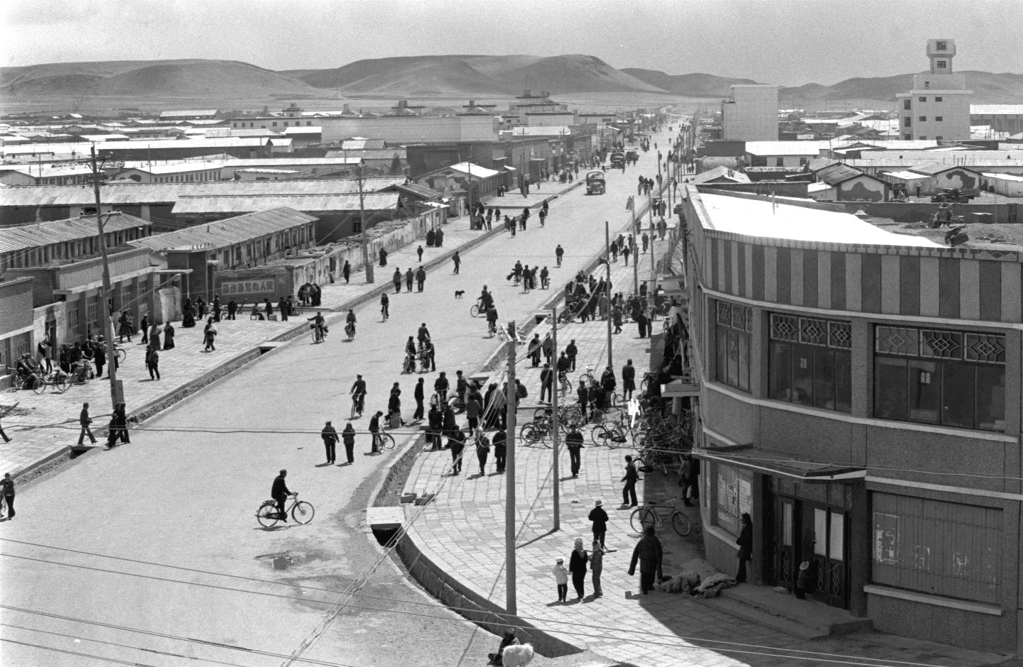連接西藏和內(nèi)地的交通大動(dòng)脈青藏公路的修筑和暢通,給西藏的經(jīng)濟(jì)發(fā)展帶來了巨大的變化。圖為1987年青藏公路線上的西藏那曲鎮(zhèn)。