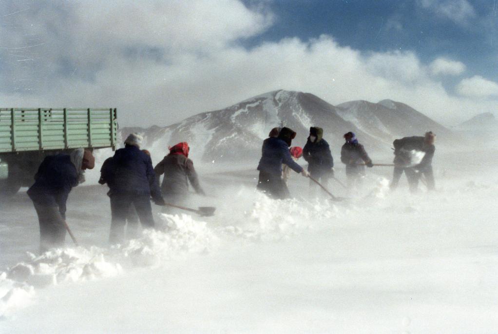 由19名藏族青年組成的109道班養(yǎng)路工在清除青藏公路上的積雪。(1992年10月26日發(fā))