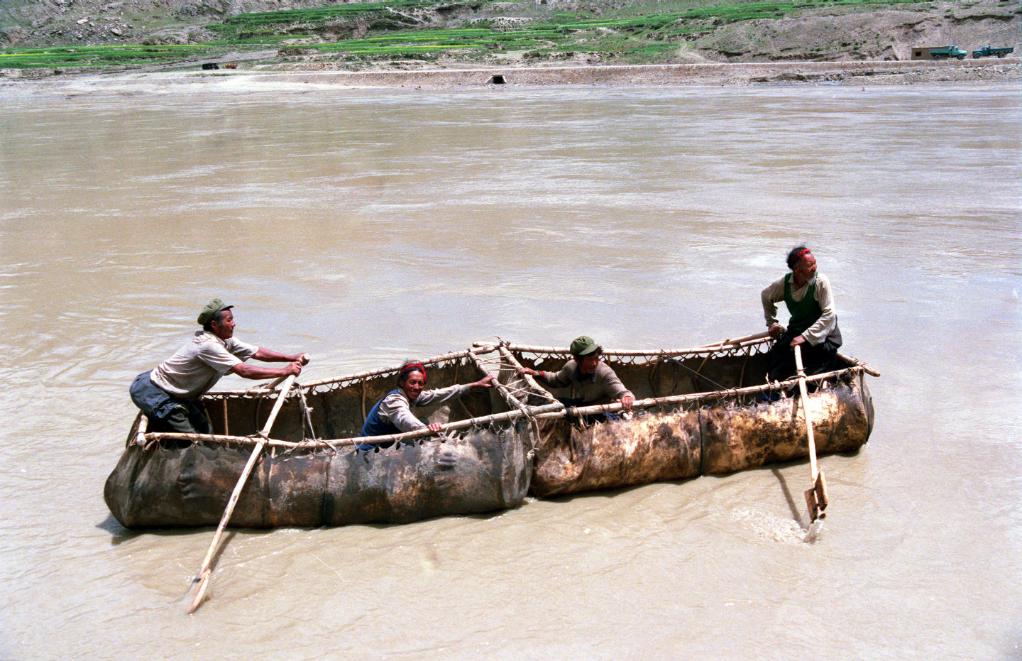 雅魯藏布江上擺渡的牛皮筏。這是在西藏常見的一種水上運(yùn)輸工具,用幾張整牛皮縫在一起制成。(1997年11月28日發(fā))