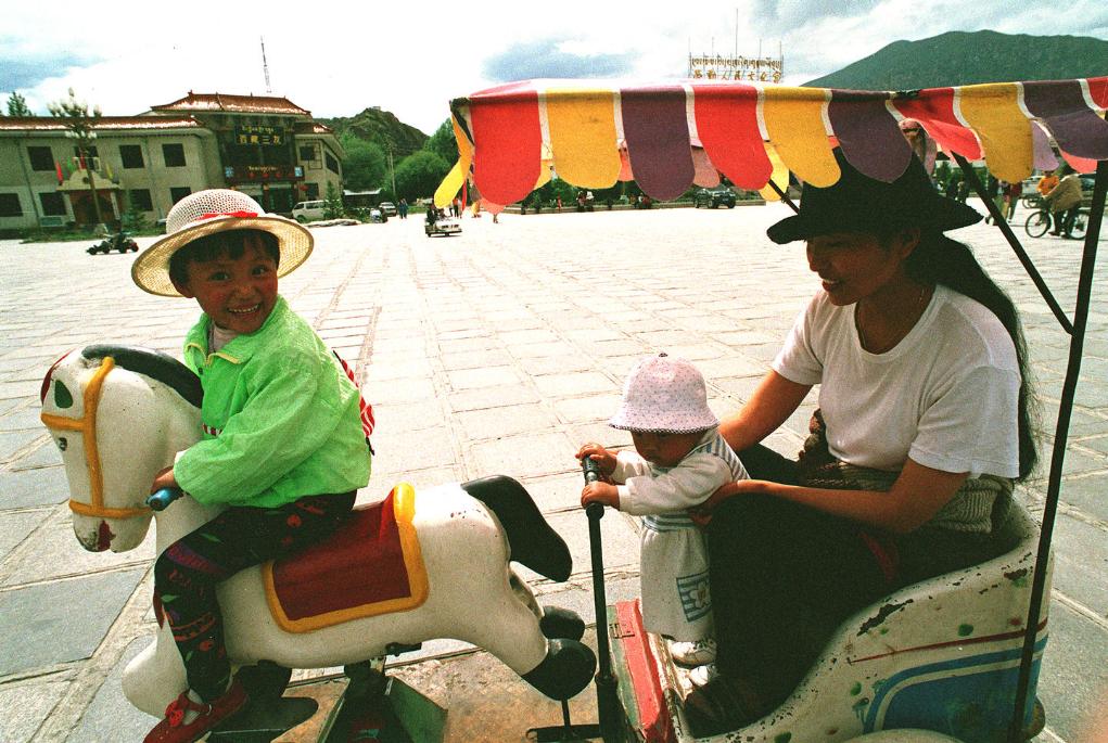 在拉薩市布達(dá)拉宮廣場(chǎng),這家藏族母女三人在乘坐兒童電動(dòng)車游玩娛樂(1997年11月13日發(fā))。