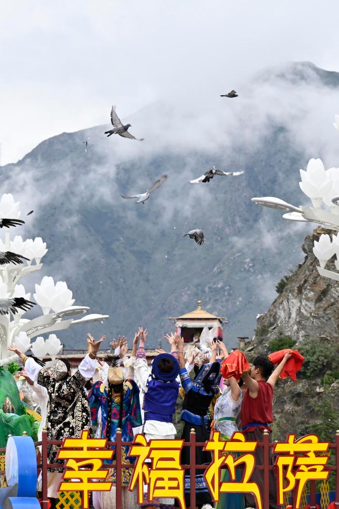 2025年8月21日上午,西藏各族各界干部群眾約2萬人歡聚拉薩市布達(dá)拉宮廣場(chǎng),熱烈慶祝西藏自治區(qū)成立60周年。這是彩車上的演員通過布達(dá)拉宮廣場(chǎng)時(shí)放飛鴿子。新華社記者 申宏 攝