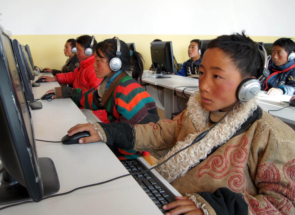由中海油援建的尼瑪縣小學(xué)學(xué)生在上計(jì)算機(jī)課(2009年9月13日攝)。