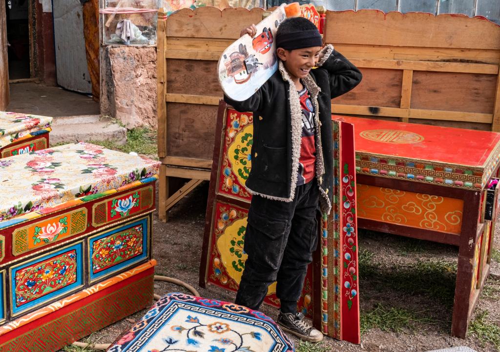 雙湖縣多瑪鄉(xiāng)仲魯瑪村的一個(gè)小朋友拿著自己心愛的滑板,準(zhǔn)備搬去新家(2022年7月13日攝)。新華社記者 孫非 攝