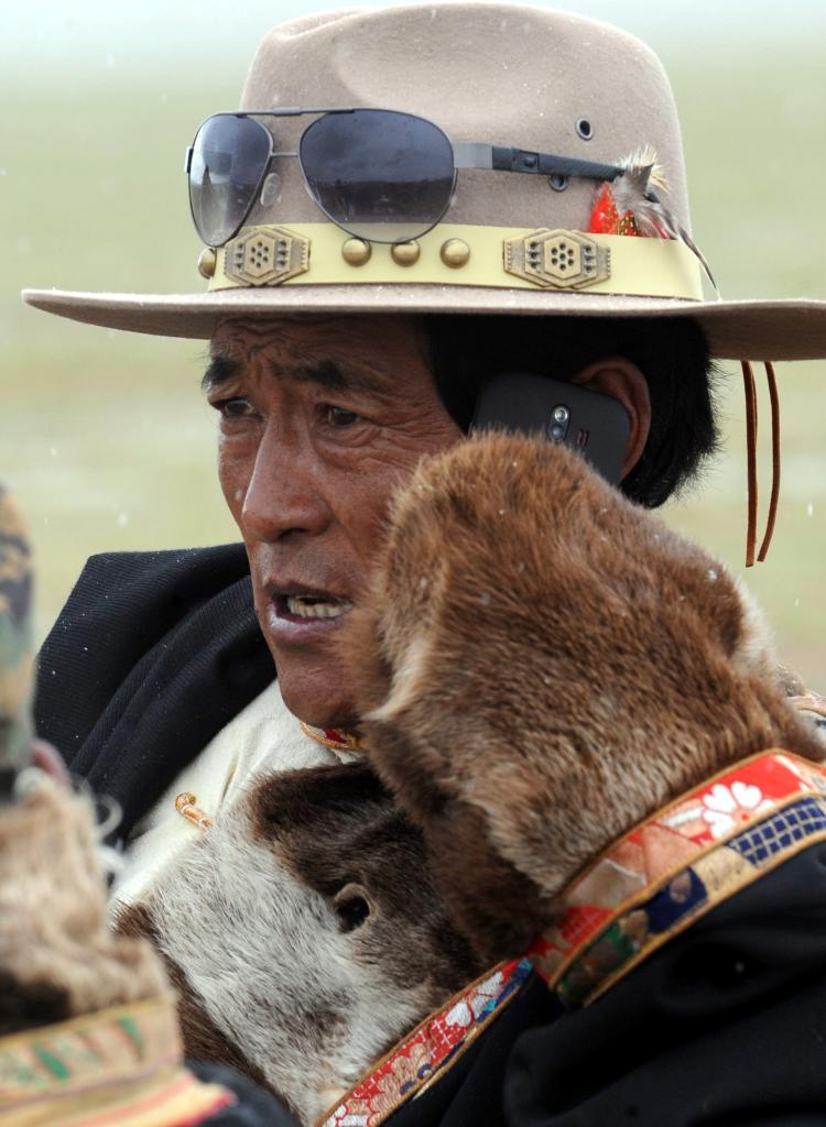 這是雙湖縣一位牧民使用手機(jī)打電話(2013年7月27日攝)。