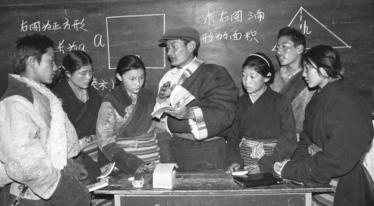 藏北高原班戈縣小學(xué)校長(zhǎng)申卻堅(jiān)村(藏族)給學(xué)生上課。(1988年1月30日發(fā))