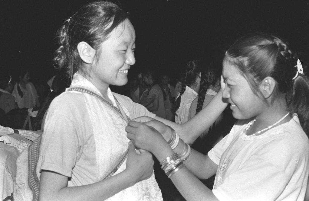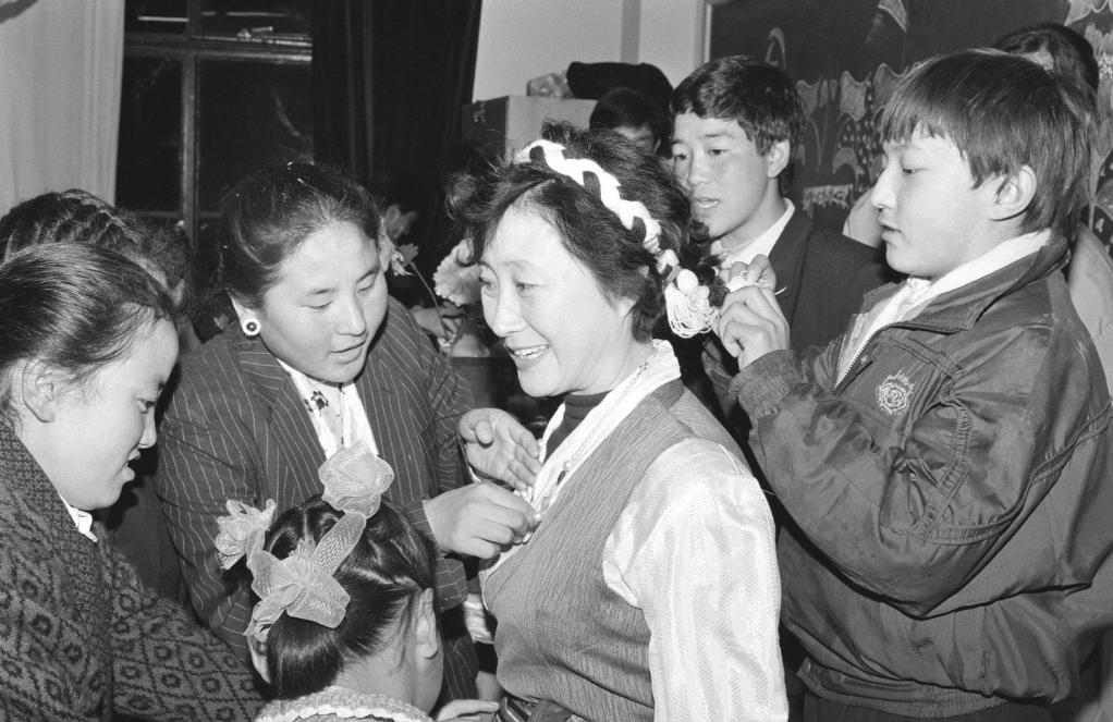 北京市西藏中學(xué)600多名高原兒女歡度藏歷水猴年新春佳節(jié)。預(yù)科二班的藏族中學(xué)生給他們的“張媽媽”——班主任張榮安老師穿上藏裝,共慶這歡樂時(shí)刻(1992年3月5日攝)。
