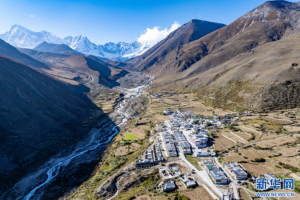 10月11日拍攝的遠(yuǎn)處庫(kù)拉崗日雪山與西藏山南市洛扎縣措玉村(無(wú)人機(jī)照片)。新華網(wǎng) 旦增努布 攝