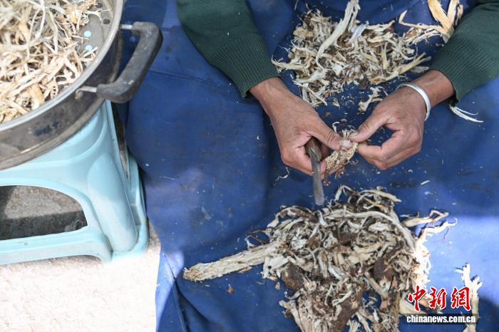 圖為雪拉村村民在給狼毒草根去皮。中新社記者 貢嘎來(lái)松 攝