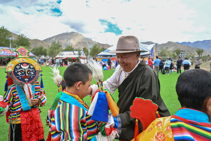 2025年7月16日,76歲的湘巴藏戲國家級非遺傳承人次仁多吉(右二)在西藏南木林縣非遺公園內(nèi)給即將表演湘巴藏戲的小演員整理服裝。新華社記者 李鑫 攝