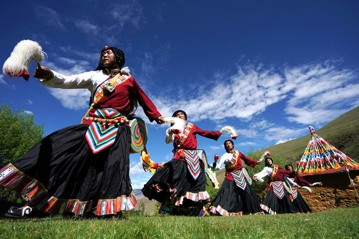 2020年7月1日,在西藏山南市瓊結(jié)縣,久河村卓舞隊(duì)的隊(duì)員在表演國家級非遺項(xiàng)目“久河卓舞”。新華社記者 詹彥 攝