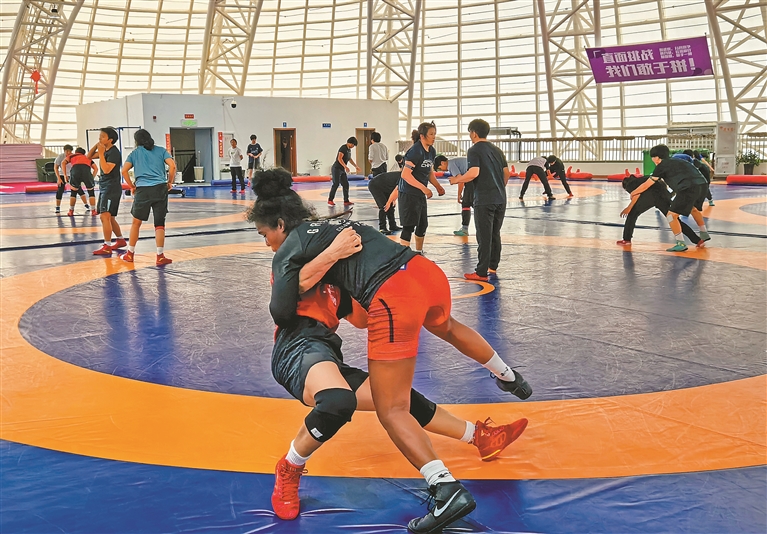 在摔跤場(chǎng)館,運(yùn)動(dòng)員進(jìn)行摔跤訓(xùn)練。記者 洛桑 攝