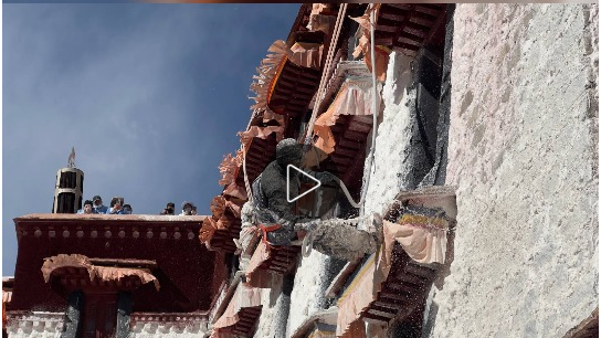 布達(dá)拉宮迎來(lái)了一年一度的“煥新”計(jì)劃,來(lái)自布達(dá)拉宮管理處的專業(yè)人員,與當(dāng)?shù)孛癖?、熱心志愿者們共同投入到這場(chǎng)“年度美容”工程中,為這座擁有千年歷史的古老宮殿披上潔白莊嚴(yán)的“新衣”。參與涂墻的民眾,身上、頭發(fā)上都沾滿了白色的涂料,仿佛落了一層細(xì)雪。同時(shí),一桶桶涂料被有序地傳送并潑灑在墻面上,布達(dá)拉宮這座屹立千年的宮殿在陽(yáng)光下也愈發(fā)明亮。除此之外,大昭寺、色拉寺等大大小小的寺廟及民居的房屋也會(huì)開始粉刷,這一工作將在藏歷九月二十二日之前完成。