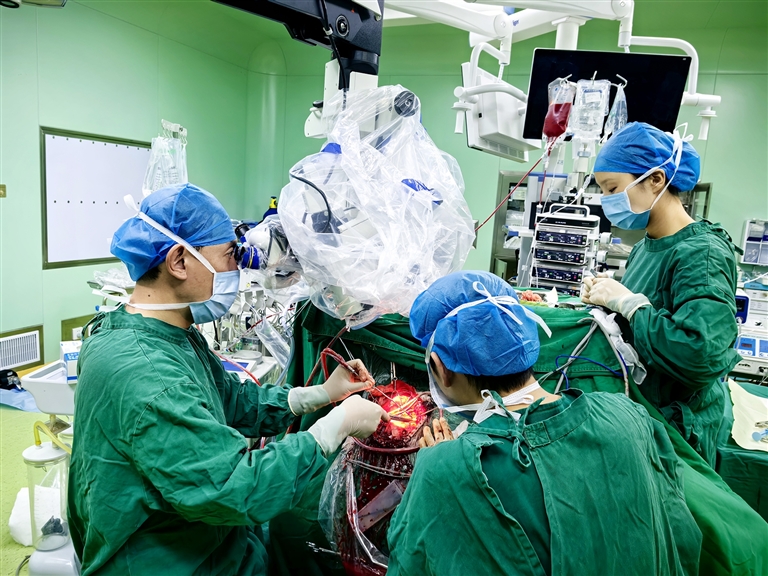 手術(shù)當(dāng)日,在麻醉科和手術(shù)室護士團隊的密切配合下,由郝強主刀,單永炳、付永鵬擔(dān)任助手,為患者實施了手術(shù)。術(shù)中,郝強在顯微鏡下仔細分離腫瘤周邊的重要血管,最大程度保護周邊腦組織不受損傷,如同在生命禁區(qū)里仔細操作。術(shù)中一次性完整切除位于不同腦葉的3枚腫瘤,由于腦膜上散在多枚微小腦膜瘤,遂將侵犯腦膜一同切除。手術(shù)過程順利,患者恢復(fù)良好。術(shù)后復(fù)查頭顱MRI顯示,顱內(nèi)腫瘤已完全消失,無殘留。目前患者積極康復(fù)治療,將擇期出院。