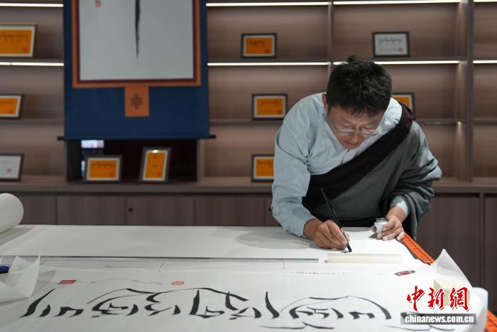圖為西藏鄉(xiāng)村振興產(chǎn)品展示中心內(nèi)的藏文書法體驗區(qū)。貢確 攝