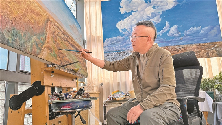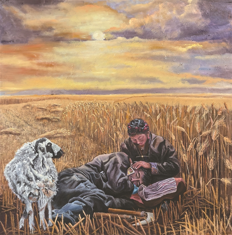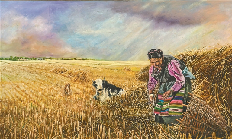“《牧歸》是我的第一幅油畫(huà)作品,描繪的是牧民春耕回家的場(chǎng)景?!编u文江指著畫(huà)室一角已經(jīng)完成的作品說(shuō)道。畫(huà)面上,夕陽(yáng)余暉中,牧民背著傳統(tǒng)農(nóng)具趕著牦牛緩緩歸來(lái),遠(yuǎn)處炊煙裊裊,濃郁的生活氣息撲面而來(lái)。
