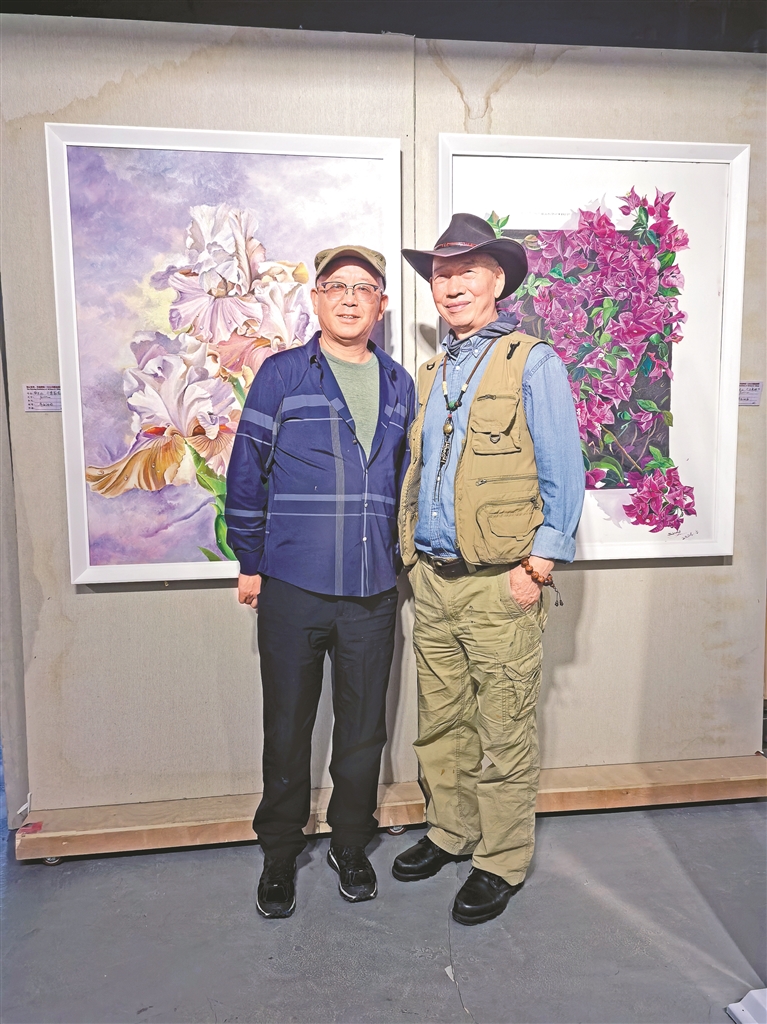 圖為鄒文江與著名軍旅畫(huà)家敬庭堯老師在作品前合影留念。