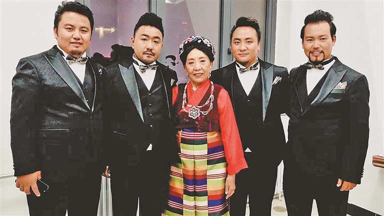 “雪域之子”組合與著名女高音歌唱家才旦卓瑪(中)合影。(圖片均由占堆提供)