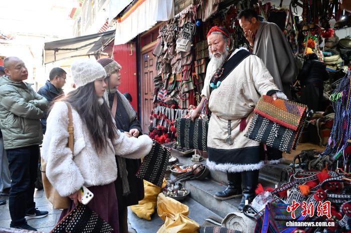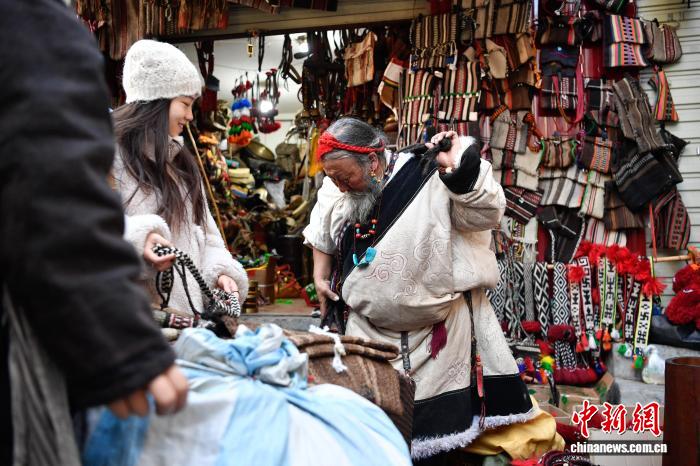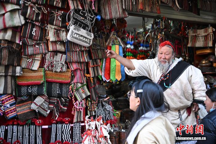 圖為藏式老物件店主次仁羅布向游客推薦藏式氆氌側(cè)掛包。中新社記者 貢嘎來松 攝