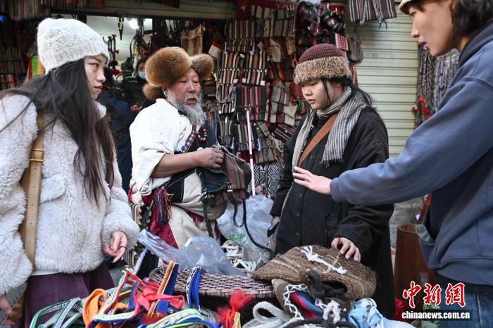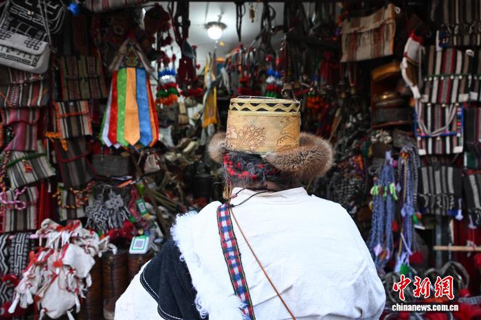 圖為藏式老物件店主次仁羅布給游客推薦藏式氆氌側(cè)掛包。中新社記者 貢嘎來松 攝