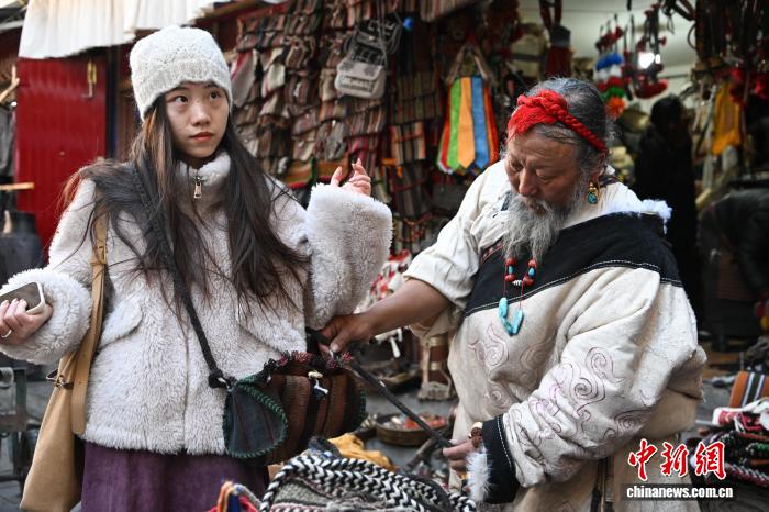 12月9日,西藏拉薩市八廓街沖賽康旁的背陰巷口,55歲店主次仁羅布的藏式老物件小店熱鬧非凡。不足30平方米的空間里,烏朵、馬包、藏式氆氌側(cè)掛包等好物琳瑯滿目,既有時(shí)光沉淀的老物件,也有手藝人新制精品。小店吸引本地民眾、年輕人及游客紛紛選購(gòu),生意紅火。圖為游客選購(gòu)藏式氆氌側(cè)掛包。中新社記者 貢嘎來松 攝