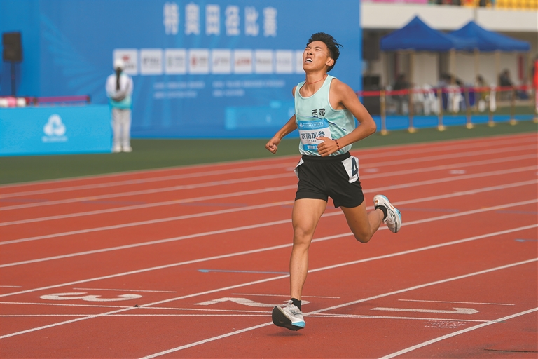 12月11日,索南加參在全國(guó)殘?zhí)貖W會(huì)特奧田徑比賽男子16—21歲組800米決賽第7組比賽中率先沖過(guò)終點(diǎn)。新華社記者 楊晨光 攝