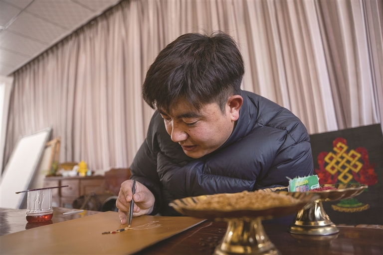 如今,仁青多吉依然在唐卡繪制與青稞文創(chuàng)之間忙碌著。陽光掠過他剛完成的一幅作品,黑頸鶴的棕褐色喙部、漸變棕灰的羽翼在光影下栩栩如生,一粒粒青稞如同被賦予了生命,靜靜訴說著林周的生態(tài)與農(nóng)耕故事。工作室里,畫師們偶爾會停下手中的筆,圍過來看他的創(chuàng)作進度,時不時交流幾句,歡聲笑語間,傳統(tǒng)技藝的火種在默契中傳遞。