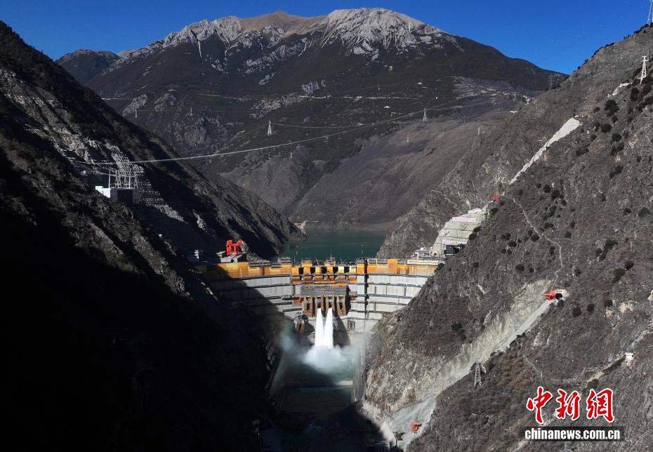 12月27日,中國在建海拔最高雙曲拱壩電站——葉巴灘水電站首批機組正式投產(chǎn)發(fā)電。葉巴灘水電站位于四川省甘孜州白玉縣與西藏自治區(qū)貢覺縣交界的金沙江干流上。水電站總裝機容量224萬千瓦,此次首批投產(chǎn)發(fā)電的機組為4號和3號機組。圖為12月25日,航拍葉巴灘水電站大壩。(無人機照片)中新社記者 王磊 攝