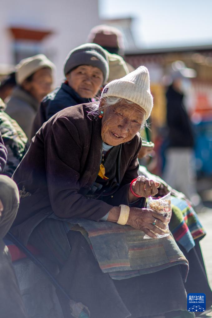 1月5日,在森嘎村村史館前的廣場(chǎng)上,老人曬著太陽(yáng)吃著零食。新華社記者 姜帆 攝