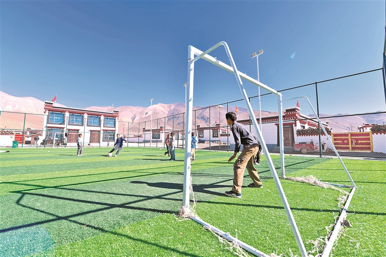圖為定日縣長所鄉(xiāng)森嘎村新修建的足球場上,孩子們在踢足球。記者 旦增嘎瓦 楊子彥 扎西頓珠 攝