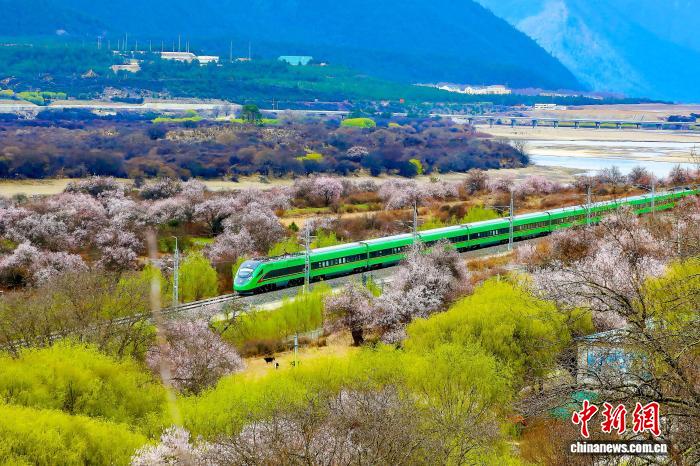 2025年西藏林芝桃花盛開時節(jié),高原復(fù)興號奔馳于拉林鐵路上。馬生明 攝