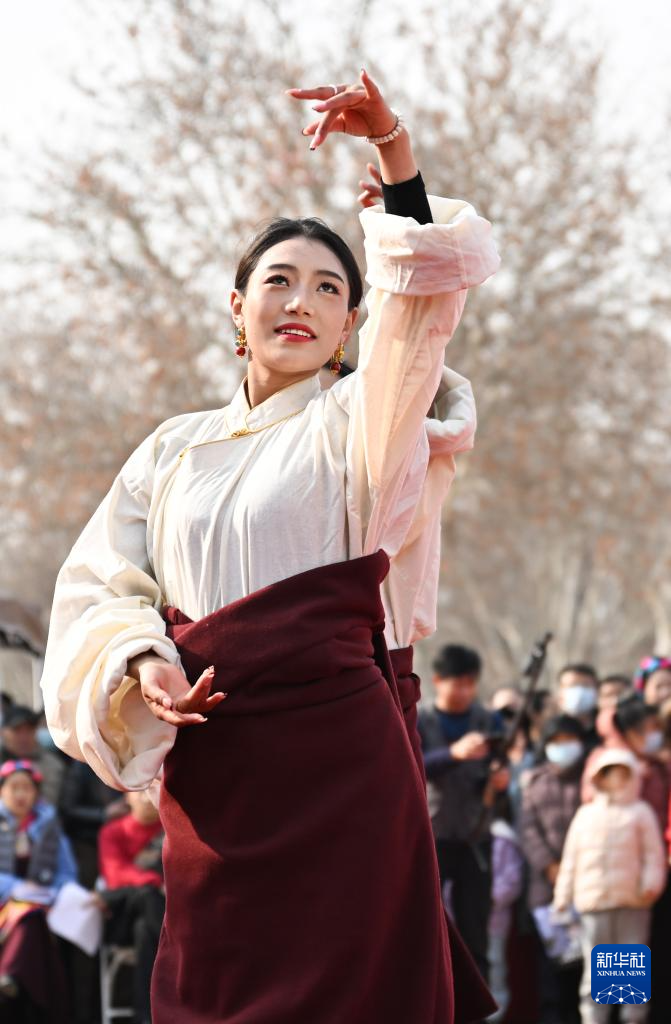 1月17日,來(lái)自西藏自治區(qū)昌都市基層文藝團(tuán)體的演員在西安大明宮國(guó)家遺址公園表演舞蹈。