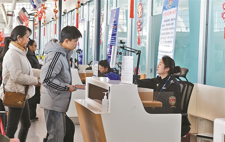 圖為工作人員為旅客辦理登機(jī)手續(xù)。記者 曲珍 攝